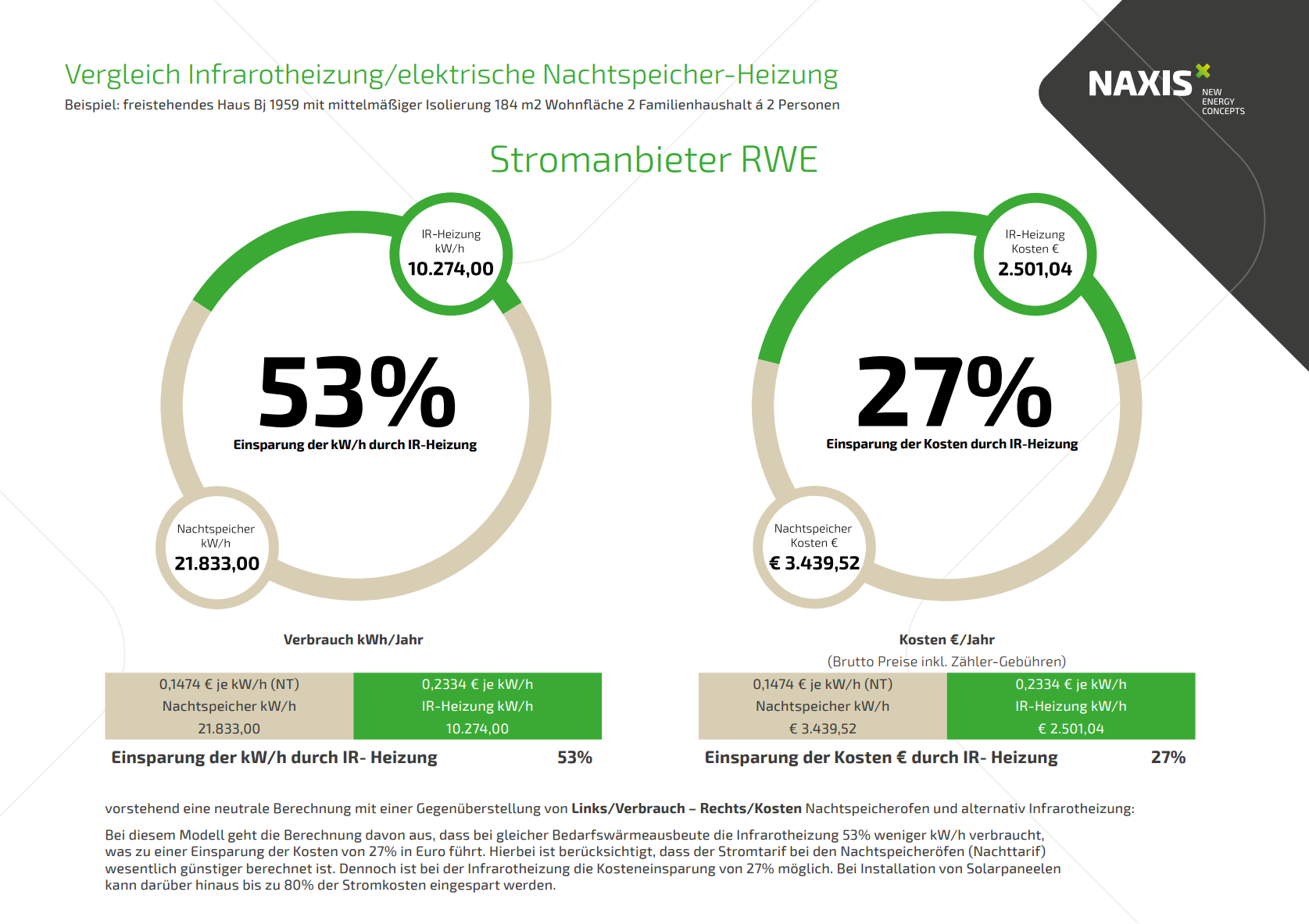 Beispielsweise wird von einem etablierten Mitbewerber bei einem Heizpaneel eine Aufheizzeit von 5 Minuten zur Erreichung von 60° C angegeben und dies als besonders effizient deklariert. Seine angegebenen spezifischen Leistungen sind ebenfalls größer; beide Faktoren führen zu einem höheren Stromverbrauch gegenüber unseren NAXIS Infrarot Heizpaneelen und senken damit die Jahreseffizienz erheblich.